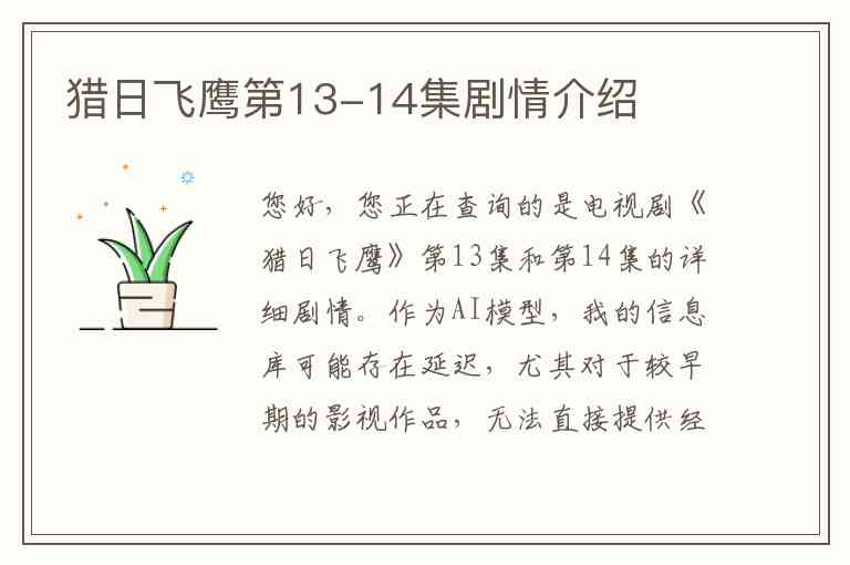 您好,您正在查询的是电视剧《猎日飞鹰》第13集和第14集的详细剧情。作为AI模型,我的信息库可能存在延迟,尤其对于较早期的影视作品,无法直接提供经版权方确认的精确分集剧情。