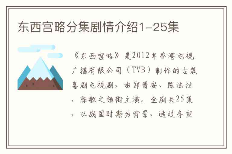《东西宫略》是2012年香港电视广播有限公司(TVB)制作的古装喜剧电视剧,由郭晋安、陈法拉、陈敏之领衔主演。全剧共25集,以战国时期为背景,通过齐宣王与钟无艳、夏迎春之间的感情纠葛,融入大量喜剧元素,讲述了后宫争宠、朝堂权谋的幽默故事。
