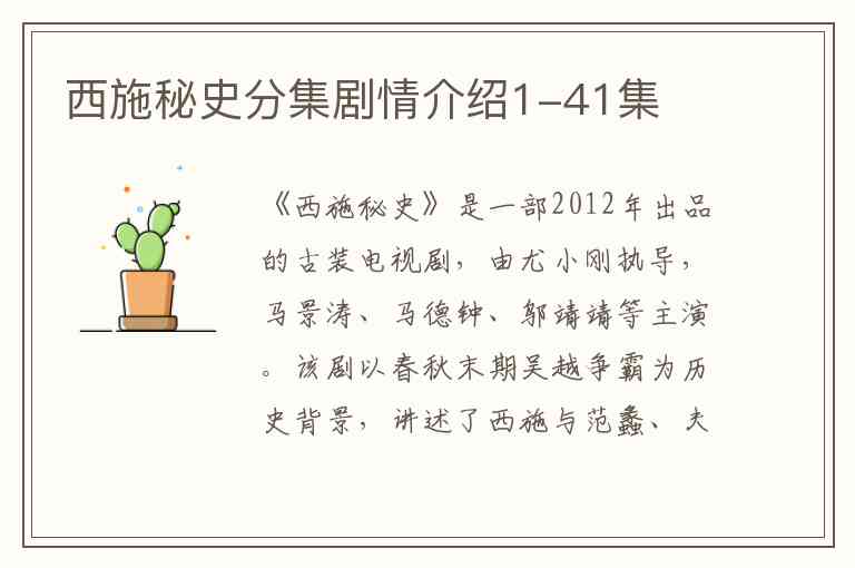 以上分集剧情是基于《西施秘史》常见剧情脉络的整合和推测,具体细节可能与实际播出版本存在细微出入。