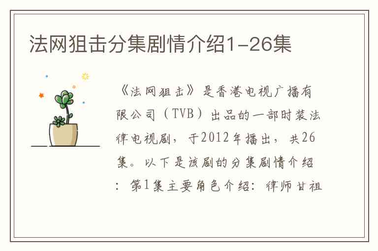 《法网狙击》是香港电视广播有限公司(TVB)出品的一部时装法律电视剧,于2012年播出,共26集。以下是该剧的分集剧情介绍: