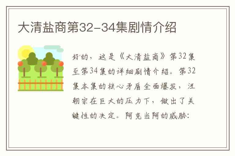 好的,这是《大清盐商》第32集至第34集的详细剧情介绍。