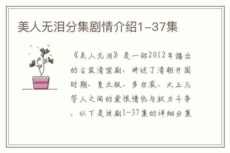 以上是《美人无泪》1-37集的详细分集剧情介绍。该剧通过大玉儿、海兰珠、皇太极、多尔衮等人的故事,展现了清朝初年的宫廷斗争与情感纠葛。
