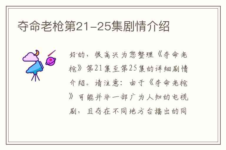 好的,很高兴为您整理《夺命老枪》第21集至第25集的详细剧情介绍。