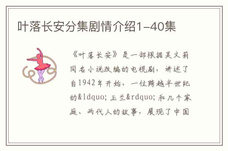 《叶落长安》是一部根据吴文莉同名小说改编的电视剧,讲述了自1942年开始,一位跨越半世纪的“玉兰”和几个家庭、两代人的故事,展现了中国人民在历史变迁中的坚韧与奋斗。以下是1-40集的详细分集剧情介绍: