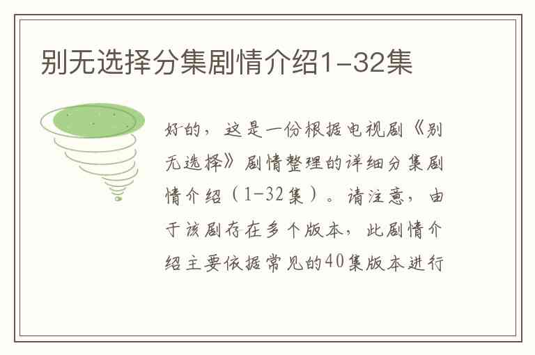 好的,这是一份根据电视剧《别无选择》剧情整理的详细分集剧情介绍(1-32集)。请注意,由于该剧存在多个版本,此剧情介绍主要依据常见的40集版本进行浓缩和梳理,以32集的框架呈现核心情节。
