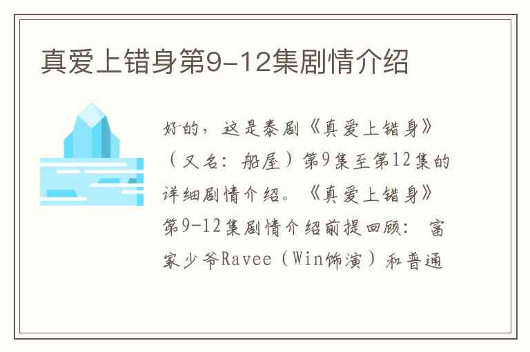 好的,这是泰剧《真爱上错身》(又名:船屋)第9集至第12集的详细剧情介绍。