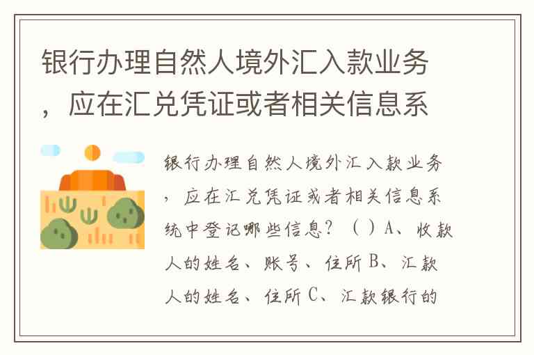 银行办理自然人境外汇入款业务,应在汇兑凭证或者相关信息系统中登记哪些信息?()A、收款人的姓名、账号、住所 B、汇款人的姓名、住所 C、汇款银行的名称和地址 D、汇款人职业、工作单位