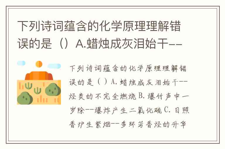 下列诗词蕴含的化学原理理解错误的是()A.蜡烛成灰泪始干--烃类的不完全燃烧 B.爆竹声中一岁除--爆炸产生二氧化硫 C.日照香炉生紫烟--多环芳香烃的升华 D.洪炉照破夜沉沉--燃烧释放二氧化碳