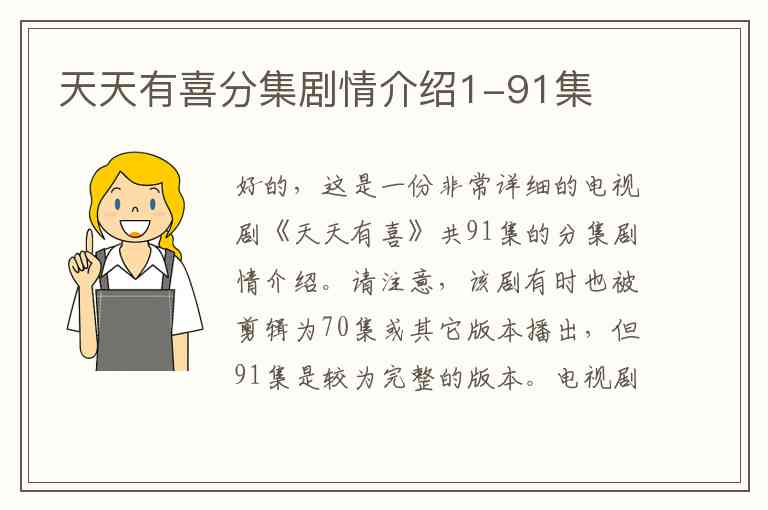 好的,这是一份非常详细的电视剧《天天有喜》共91集的分集剧情介绍。请注意,该剧有时也被剪辑为70集或其它版本播出,但91集是较为完整的版本。