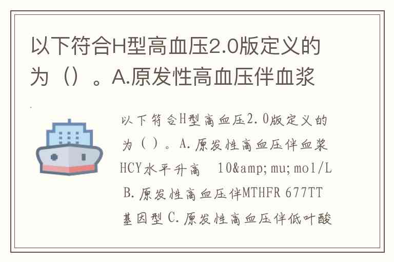以下符合H型高血压2.0版定义的为()。A.原发性高血压伴血浆HCY水平升高≧10μmol/L B.原发性高血压伴MTHFR 677TT基因型 C.原发性高血压伴低叶酸水平依据基因型决定水平 D.以上都是