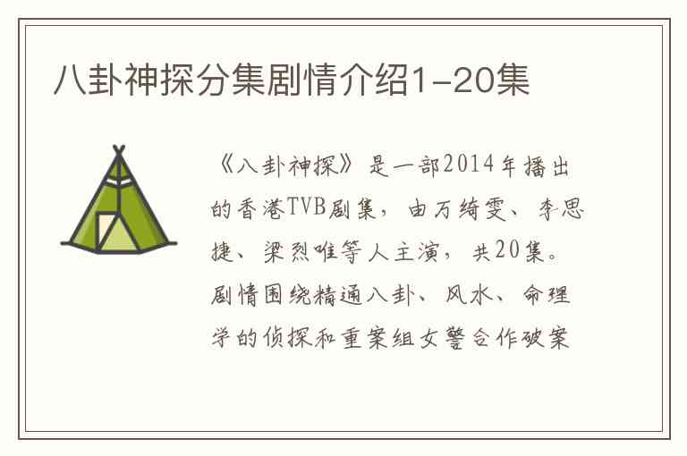 《八卦神探》是一部2014年播出的香港TVB剧集,由万绮雯、李思捷、梁烈唯等人主演,共20集。剧情围绕精通八卦、风水、命理学的侦探和重案组女警合作破案的故事。以下是第1集至第20集的详细分集剧情介绍: