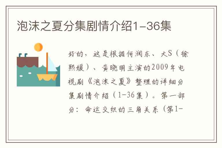 好的,这是根据何润东、大S(徐熙媛)、黄晓明主演的2009年电视剧《泡沫之夏》整理的详细分集剧情介绍(1-36集)。
