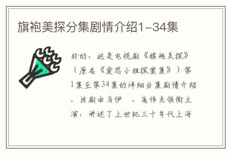 好的,这是电视剧《旗袍美探》(原名《爱思小姐探案集》)第1集至第34集的详细分集剧情介绍。该剧由马伊琍、高伟光领衔主演,讲述了上世纪三十年代上海,游学欧洲多年的富家女苏雯丽(马伊琍 饰)回到上海,与法租界中央巡捕房探长罗秋恒(高伟光 饰)一同破解悬案的故事。