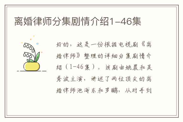 好的,这是一份根据电视剧《离婚律师》整理的详细分集剧情介绍(1-46集)。该剧由姚晨和吴秀波主演,讲述了两位顶尖的离婚律师池海东和罗鹂,从对手到搭档,最终成为伴侣的故事。