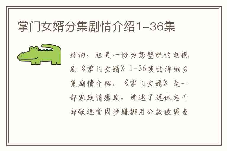 好的,这是一份为您整理的电视剧《掌门女婿》1-36集的详细分集剧情介绍。