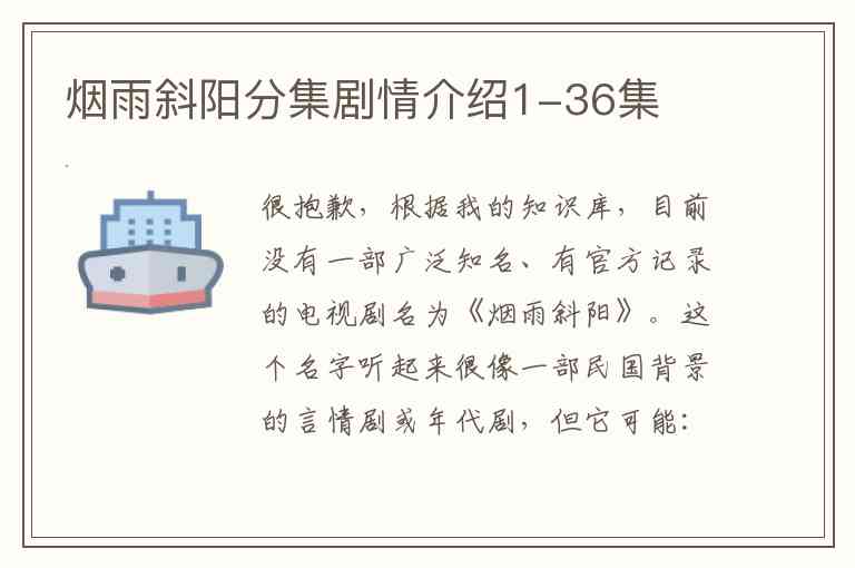 很抱歉,根据我的知识库,目前没有一部广泛知名、有官方记录的电视剧名为《烟雨斜阳》。这个名字听起来很像一部民国背景的言情剧或年代剧,但它可能: