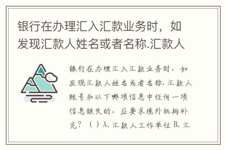 银行在办理汇入汇款业务时,如发现汇款人姓名或者名称.汇款人账号和以下哪项信息中任何一项信息缺失的,应要求境外机构补充?()A.汇款人工作单位 B.汇款人住所 C.汇款行地址 D.汇款人身份证明文件