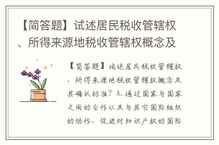 【简答题】试述居民税收管辖权、所得来源地税收管辖权概念及其确认标准?A.通过国家与国家之间的合作以及与其它国际组织的协作,促进对知识产权的国际保护 B.保证各种知识产权方面的公约所建立的联盟之间在行政上的合作 C.鼓励缔结保护知识产权的国际协定 D.承担或参与为促进保护知识产权的任何其它国际协定的行政管理