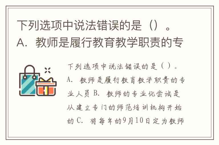 下列选项中说法错误的是()。A.教师是履行教育教学职责的专业人员 B.教师的专业化尝试是从建立专门的师范培训机构开始的 C.将每年的9月10日定为教师节是在1988年全国人民代表大会常务委员会上确定的 D.对于非师范院校毕业或者教师资格考试合格的公民申请认定教师资格的,应当进行面试和试讲
