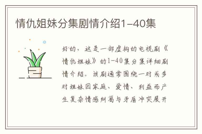 好的,这是一部虚构的电视剧《情仇姐妹》的1-40集分集详细剧情介绍。该剧通常围绕一对或多对姐妹因家庭、爱情、利益而产生复杂情感纠葛与矛盾冲突展开。以下是一个典型的此类题材的剧情框架: