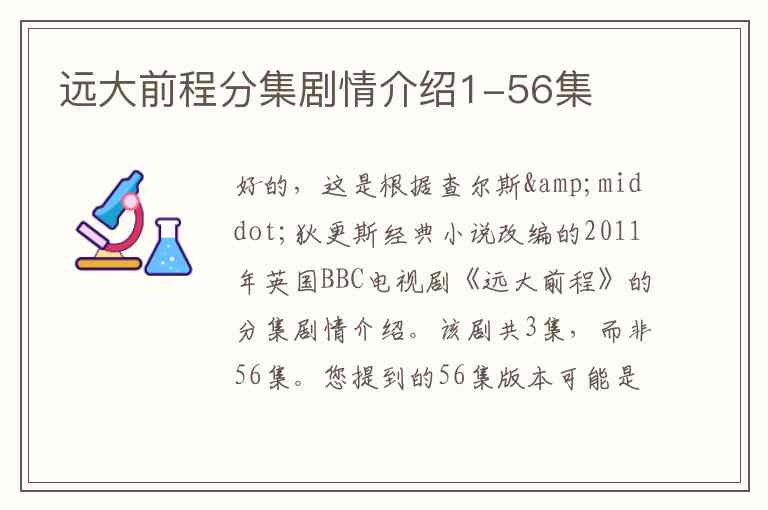 好的,这是根据查尔斯·狄更斯经典小说改编的2011年英国BBC电视剧《远大前程》的分集剧情介绍。该剧共3集,而非56集。您提到的56集版本可能是指其他改编版或剧集。