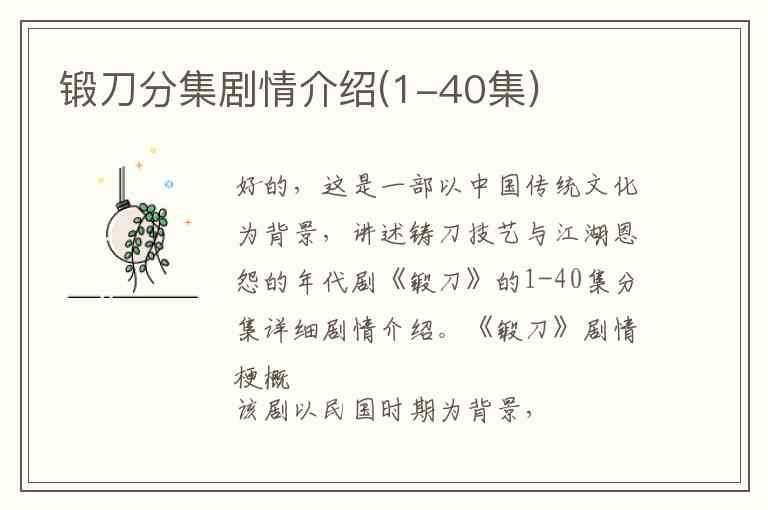 好的,这是一部以中国传统文化为背景,讲述铸刀技艺与江湖恩怨的年代剧《锻刀》的1-40集分集详细剧情介绍。