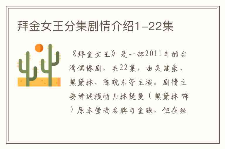 《拜金女王》是一部2011年的台湾偶像剧,共22集,由吴建豪、熊黛林、陈晓东等主演。剧情主要讲述模特儿林楚曼(熊黛林 饰)原本崇尚名牌与金钱,但在经历一系列事件后,逐渐领悟到真爱与人生真谛的故事。以下是各集的详细剧情介绍: