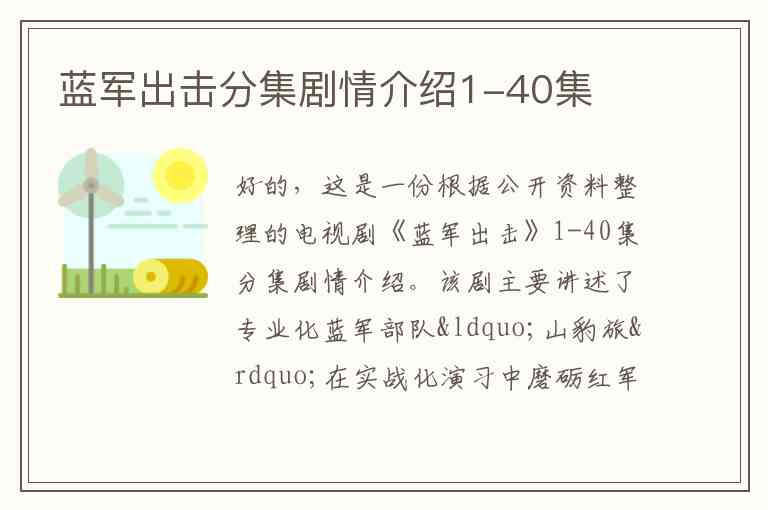 好的,这是一份根据公开资料整理的电视剧《蓝军出击》1-40集分集剧情介绍。该剧主要讲述了专业化蓝军部队“山豹旅”在实战化演习中磨砺红军,推动军队改革和战斗力提升的故事。