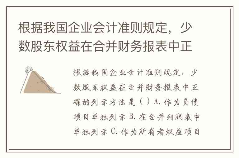 根据我国企业会计准则规定,少数股东权益在合并财务报表中正确的列示方法是()A.作为负债项目单独列示 B.在合并利润表中单独列示 C.作为所有者权益项目单独列示 D.作为长期股权投资调整项目列示