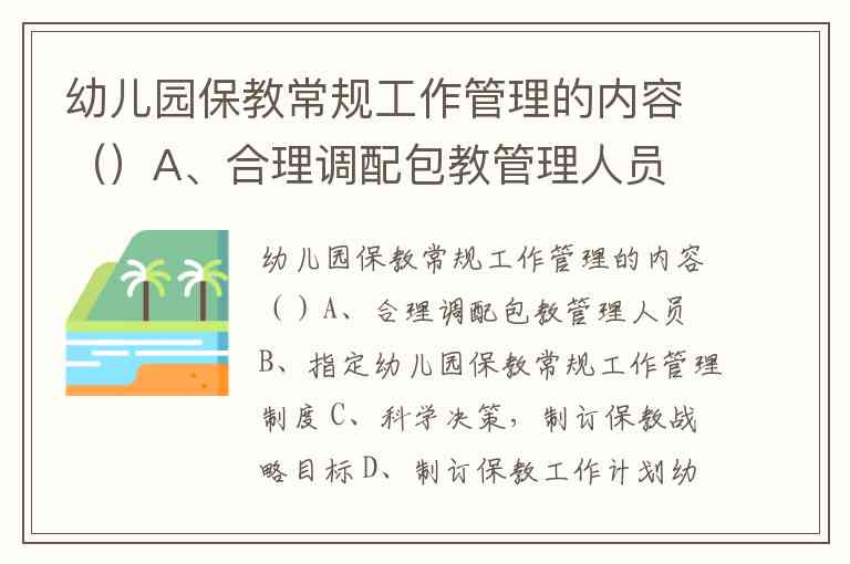 幼儿园保教常规工作管理的内容()A、合理调配包教管理人员 B、指定幼儿园保教常规工作管理制度 C、科学决策,制订保教战略目标 D、制订保教工作计划