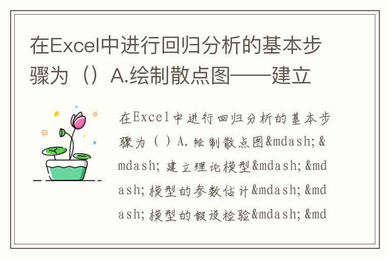 在Excel中进行回归分析的基本步骤为()A.绘制散点图——建立理论模型——模型的参数估计——模型的假设检验——模型的应用 B.建立理论模型——绘制散点图——模型的参数估计——模型的假设检验——模型的应用 C.绘制散点图——建立理论模型——模型的假设检验——模型的参数估计——模型的应用 D.建立理论模型——绘制散点图——模型的假设检验——模型的参数估计——模型的应用