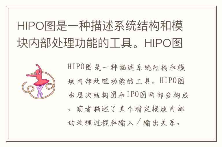 HIPO图是一种描述系统结构和模块内部处理功能的工具。HIPO图由层次结构图和IPO图两部分构成,前者描述了某个特定模块内部的处理过程和输入/输出关系,后者描述了整个系统的设计结构以及各类模块之间的关系。