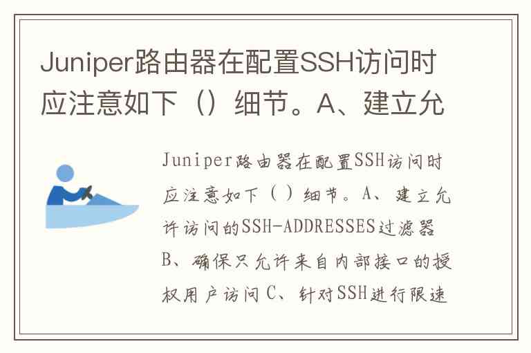 在配置Juniper路由器SSH访问时,需通过访问控制、接口安全和服务限制三重机制保障安全性。根据文档中的最佳实践,正确选项为A、B、C,具体分析如下: