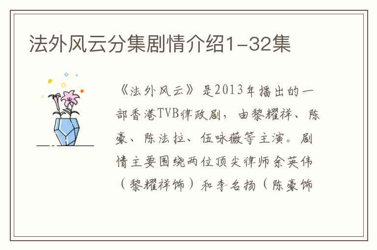 《法外风云》是2013年播出的一部香港TVB律政剧,由黎耀祥、陈豪、陈法拉、伍咏薇等主演。剧情主要围绕两位顶尖律师余英伟(黎耀祥饰)和李名扬(陈豪饰)在法庭上的对抗与合作,以及他们处理的各种错综复杂的案件。