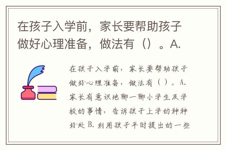 在孩子入学前,家长要帮助孩子做好心理准备,做法有()。A.家长有意识地聊一聊小学生及学校的事情,告诉孩子上学的种种好处 B.利用孩子平时提出的一些问题进行引导 C.提前带孩子到新学校参观、熟悉环境 D.可以将负面情绪传递给孩子