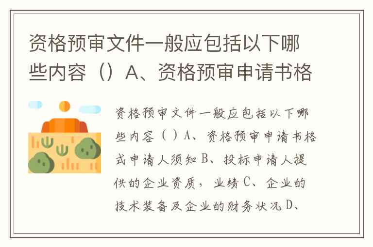 资格预审文件是筛选潜在投标人的核心依据,其内容需兼顾规范性与项目特殊性。根据《标准施工招标资格预审文件》及政府采购实践,正确选项为 A、B、C、E,具体解析如下: