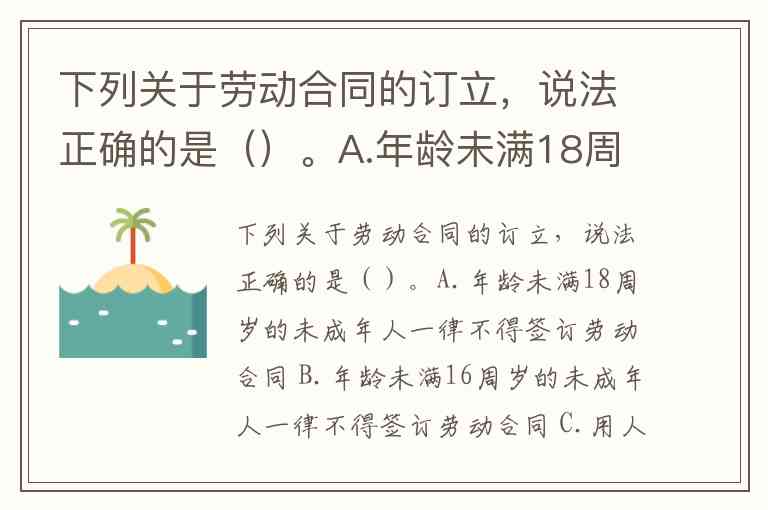 下列关于劳动合同的订立,说法正确的是()。A.年龄未满18周岁的未成年人一律不得签订劳动合同 B.年龄未满16周岁的未成年人一律不得签订劳动合同 C.用人单位设立的分支机构,依法取得营业执照或者登记证书的,可以作为用人单位与劳动者订立劳动合同 D.用人单位设立的分支机构,未依法取得营业执照或者登记证书的,一律不得与劳动者订立劳动合同