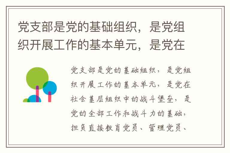 党的基层组织是党的全部工作和战斗力的基础,准确理解和把握其职责对于加强党的建设至关重要。根据《中国共产党章程》第三十四条,党支部担负直接教育党员、管理党员、监督党员和组织群众、宣传群众、凝聚群众、服务群众的职责。这“七项职责”是新时代党支部建设的根本遵循,体现了党建工作与群众工作的有机统一。
