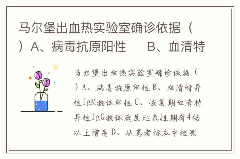 马尔堡出血热实验室确诊依据()A、病毒抗原阳性 B、血清特异性IgM抗体阳性 C、恢复期血清特异性IgG抗体滴度比急性期有4倍以上增高 D、从患者标本中检测出马尔堡病毒RNA E、血沉加快,血清转氨酶升高