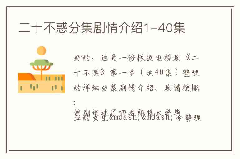好的,这是一份根据电视剧《二十不惑》第一季(共40集)整理的详细分集剧情介绍。