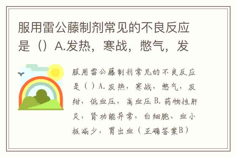 服用雷公藤制剂常见的不良反应是()A.发热,寒战,憋气,发绀,低血压,高血压 B.药物性肝炎,肾功能异常,白细胞、血小板减少,胃出血(正确答案B) C.黄疸,胰腺炎,视物模糊,运动障碍,低钾血症、低氯血症、低钠血症 D.胸闷憋气,心悸,发绀,心律失常,高血压 E.血压下降,视觉、听觉异常,抽搐,惊厥,血尿