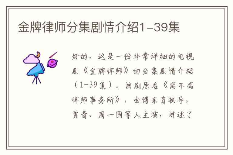 好的,这是一份非常详细的电视剧《金牌律师》的分集剧情介绍(1-39集)。该剧原名《离不离律师事务所》,由傅东育执导,贾青、周一围等人主演,讲述了在“离不离律师事务所”里,一群专门打离婚官司的律师们的故事。