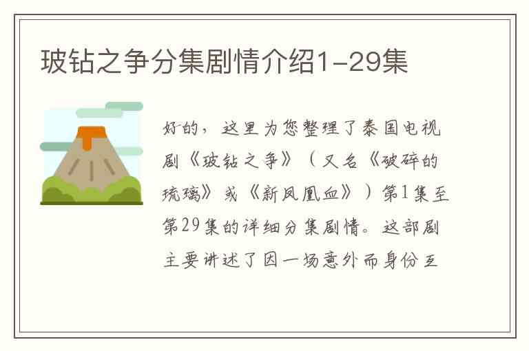 好的,这里为您整理了泰国电视剧《玻钻之争》(又名《破碎的琉璃》或《新凤凰血》)第1集至第29集的详细分集剧情。