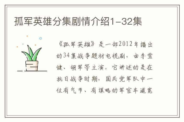 希望这份详细的分集剧情能帮助您更好地了解《孤军英雄》的整个故事脉络。
