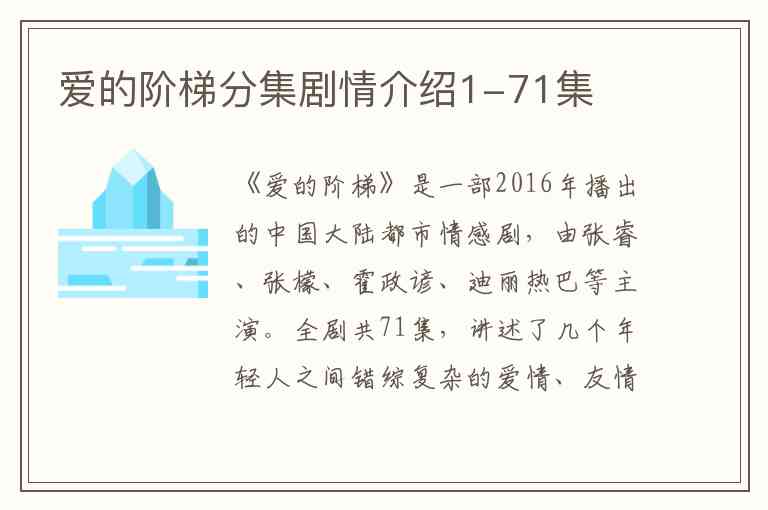 《爱的阶梯》是一部2016年播出的中国大陆都市情感剧,由张睿、张檬、霍政谚、迪丽热巴等主演。全剧共71集,讲述了几个年轻人之间错综复杂的爱情、友情、家族恩怨与商战故事。
