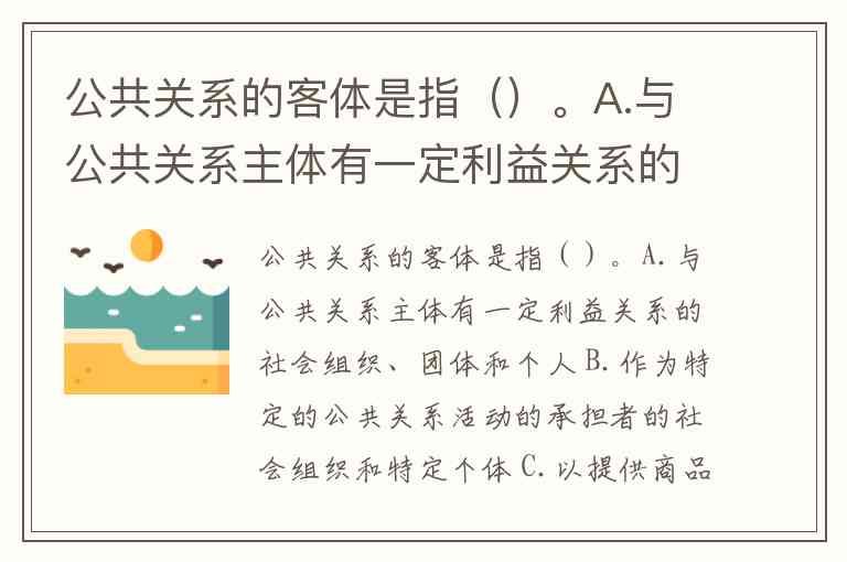 公共关系的客体是指()。A.与公共关系主体有一定利益关系的社会组织、团体和个人 B.作为特定的公共关系活动的承担者的社会组织和特定个体 C.以提供商品、劳务为手段,以实现营利为目的的基本经济单位 D.公共关系的活动方式和工作过程
