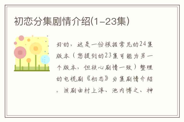 好的,这是一份根据常见的24集版本(您提到的23集可能为另一个版本,但核心剧情一致)整理的电视剧《初恋》分集剧情介绍。该剧由村上淳、池内博之、神木隆之介等主演,讲述了围绕“初恋”这一主题,几个家庭和人物之间交织的情感故事。