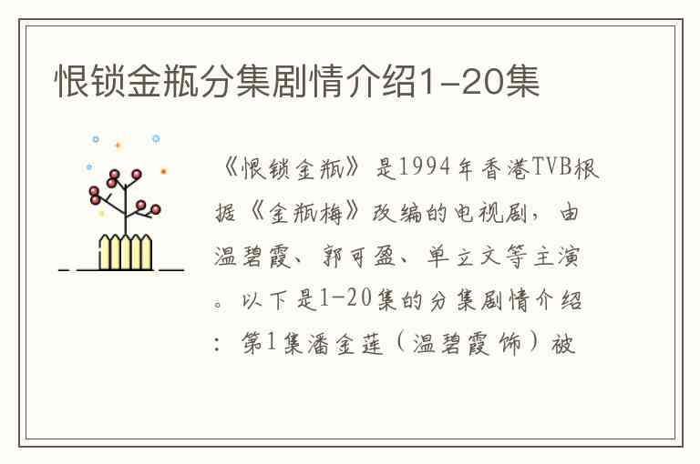 《恨锁金瓶》是1994年香港TVB根据《金瓶梅》改编的电视剧,由温碧霞、郭可盈、单立文等主演。以下是1-20集的分集剧情介绍: