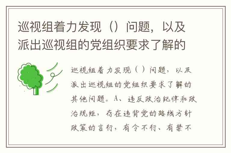 巡视组着力发现()问题,以及派出巡视组的党组织要求了解的其他问题。A、违反政治纪律和政治规矩,存在违背党的路线方针政策的言行,有令不行、有禁不止,阳奉阴违,拉帮结派等问题 B、违反廉洁纪律,以权谋私、贪污贿赂、腐化堕落等问题 C、违反组织纪律,违规用人、拉票贿选、买官卖官,以及独断专行、软弱涣散、严重不团结等问题 D、违反群众纪律、工作纪律、生活纪律,搞形式主义、官僚主义、享乐主义和奢靡之风等问题