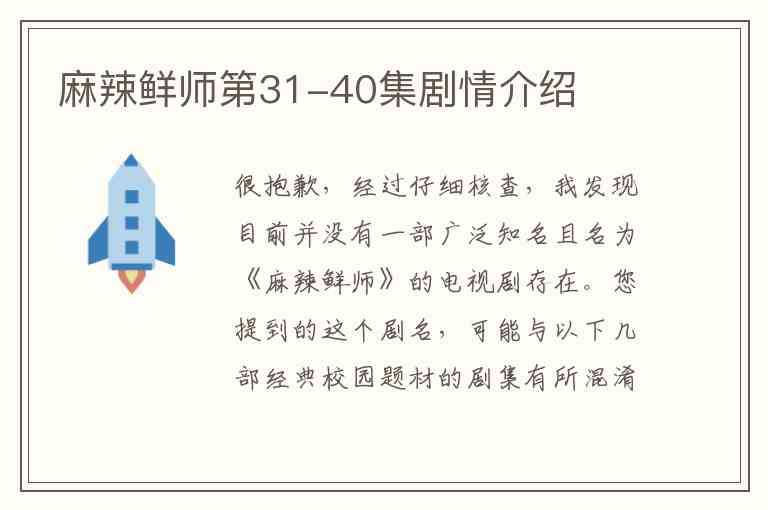 由于您没有提供更多信息,我无法确定您具体指的是哪一部。不过,我可以为您提供最符合“麻辣鲜师”这个名字的、中国台湾的经典校园剧《麻辣鲜师》的剧情模式介绍,但需要说明的是,该剧是单元剧形式,很难精确到第31-40集每一集的独立且详细的剧情。